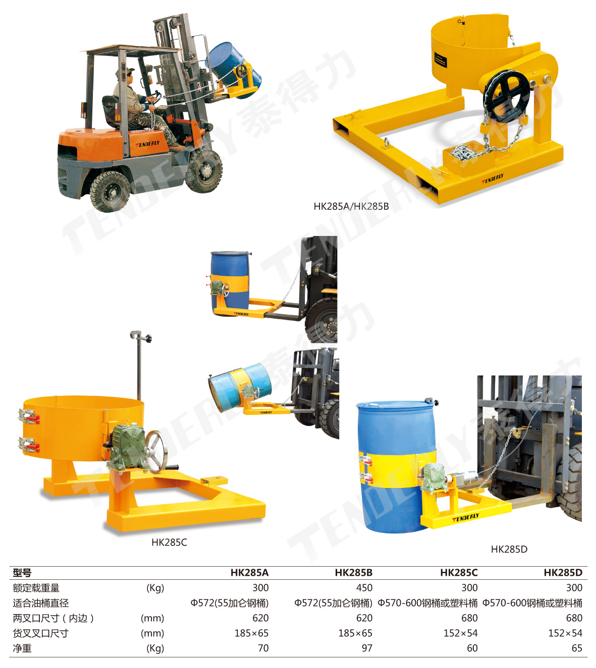 ● HK285A,HK285B驾驶员无需离开叉车,通过链条带动链轮机构即可实现油桶的翻转