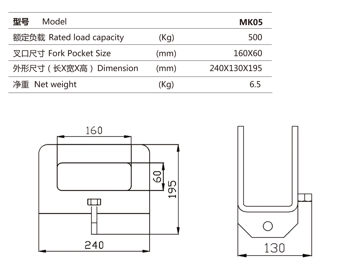 ● 可沿货叉长度方向调整安装位置,带有1个锁紧螺柱,便于固定