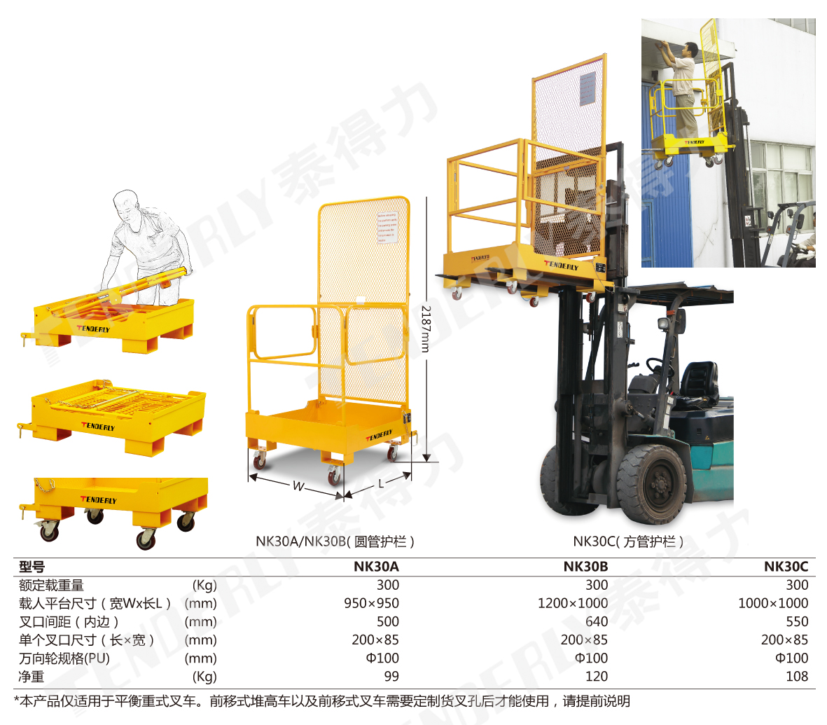 ● 载人平台通过安全长销和和链条固定在货叉架上,确保不会滑动