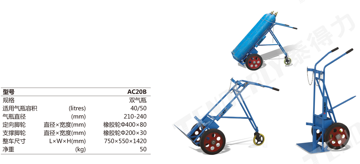 ● 泰得力气瓶推车采用橡胶实心轮胎(尼龙支撑轮)