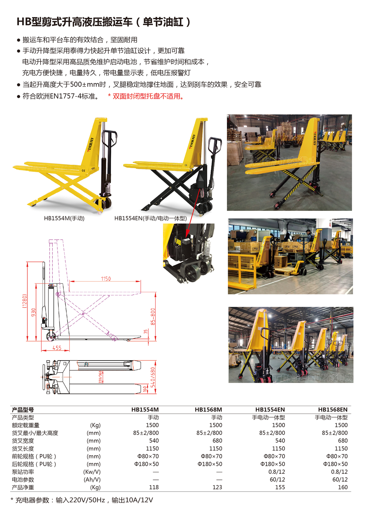 泰得力HB型高起升液压搬运车(又称剪式搬运车,高搬车),采用单节油缸设计,可靠性更高。当升起高度大于500mm时,叉腿稳定地撑住地面,达到刹车的效果,安全可靠,广泛应用于车间工位操作单面托盘,减少弯腰,提高工效。半电动款可电动升降,并且通过加装红外光电系统(选配),实现放料或取料的自动升降作业。