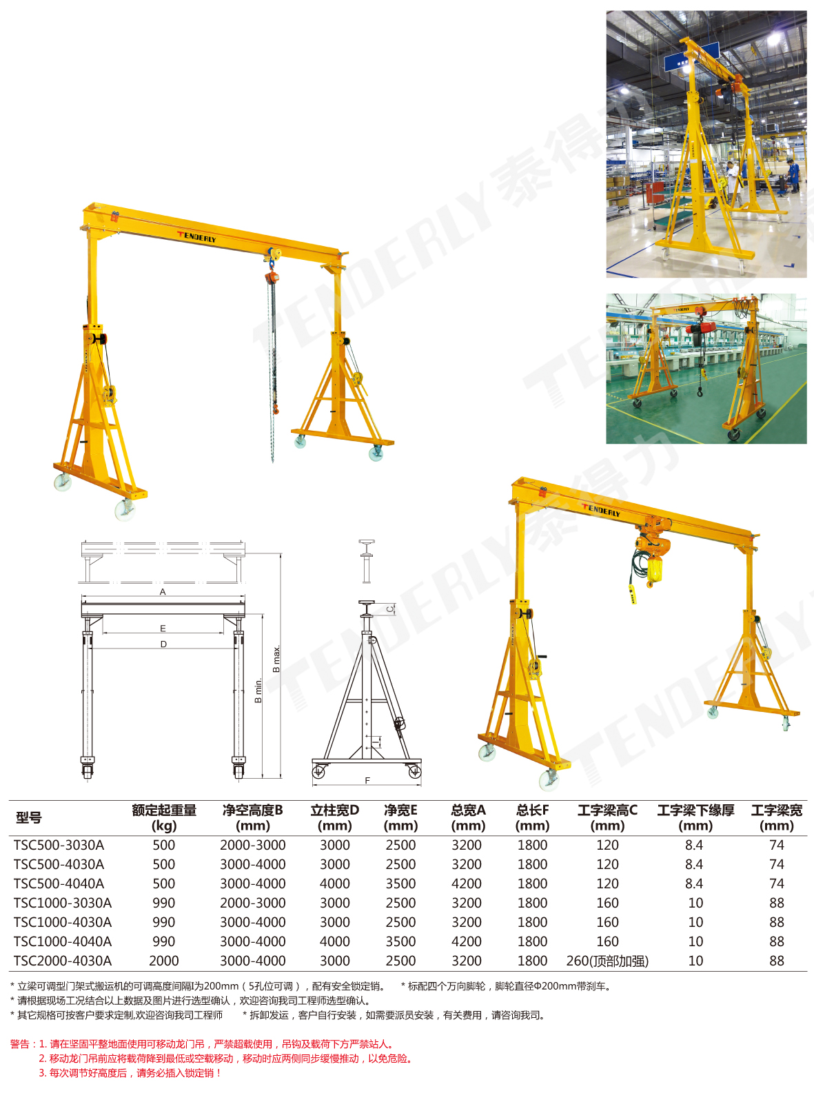 ● 泰得力独有的手摇同步机构可轻松调节门架高度(5孔位可调)、两侧立柱配有锁定销确保安全