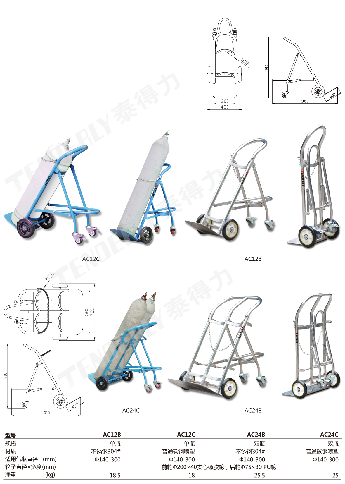 ● 泰得力气瓶推车采用橡胶实心大轮及PU小轮