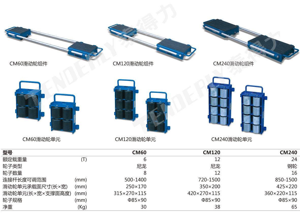 ● 每个CM型滑动轮由两个滑动轮单元及联接杆组成 ● 两个滑动轮单元之间的联接杆间距可调节 ● 载重能力大,适用于重型货物的移动