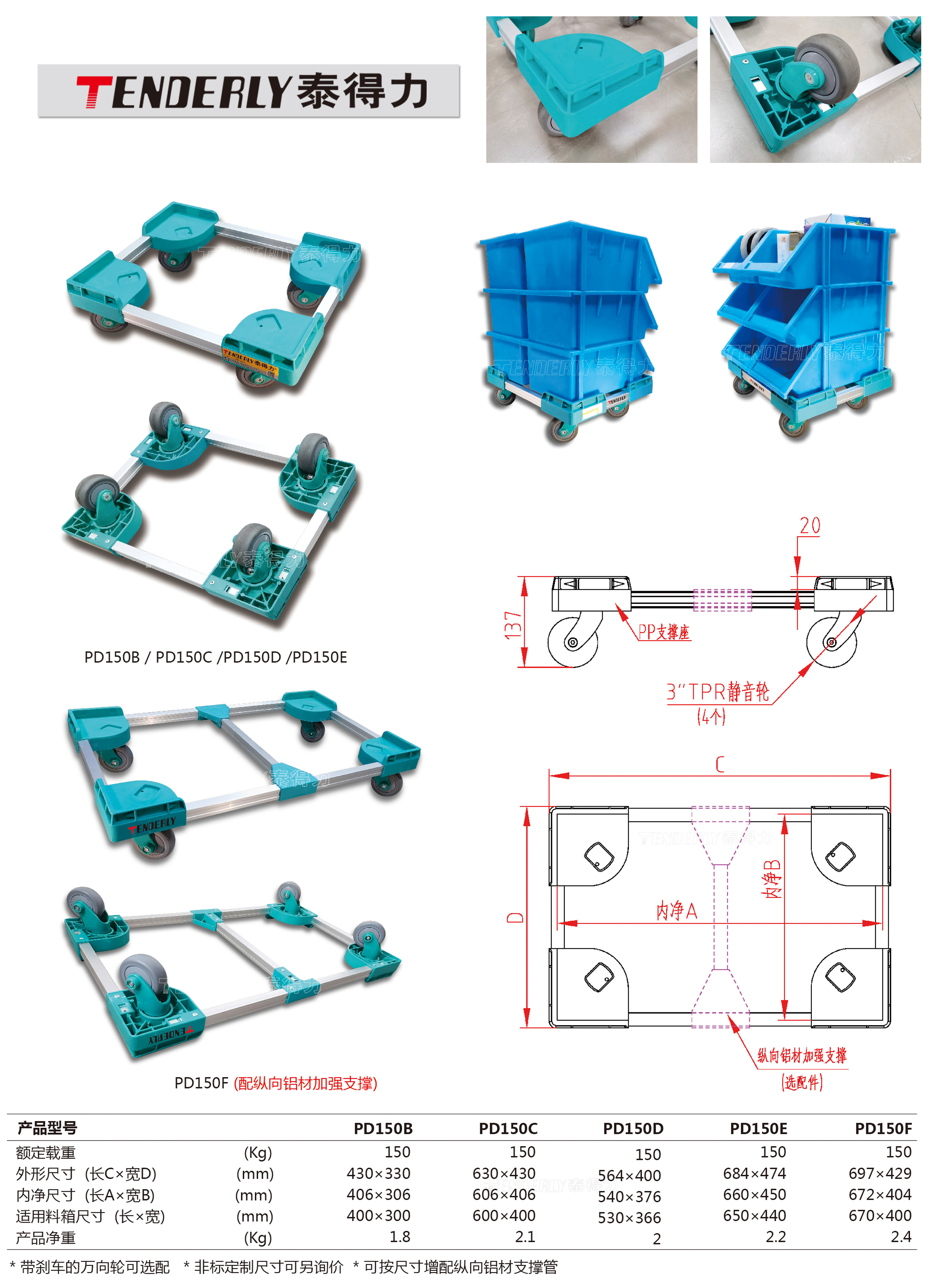 ● 标配4只TPR万向脚轮(无刹)及PP轮架,推行特别灵活且静音